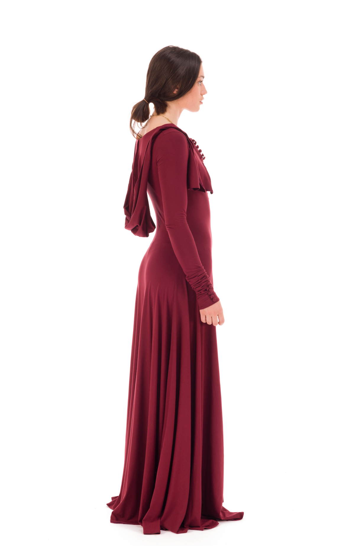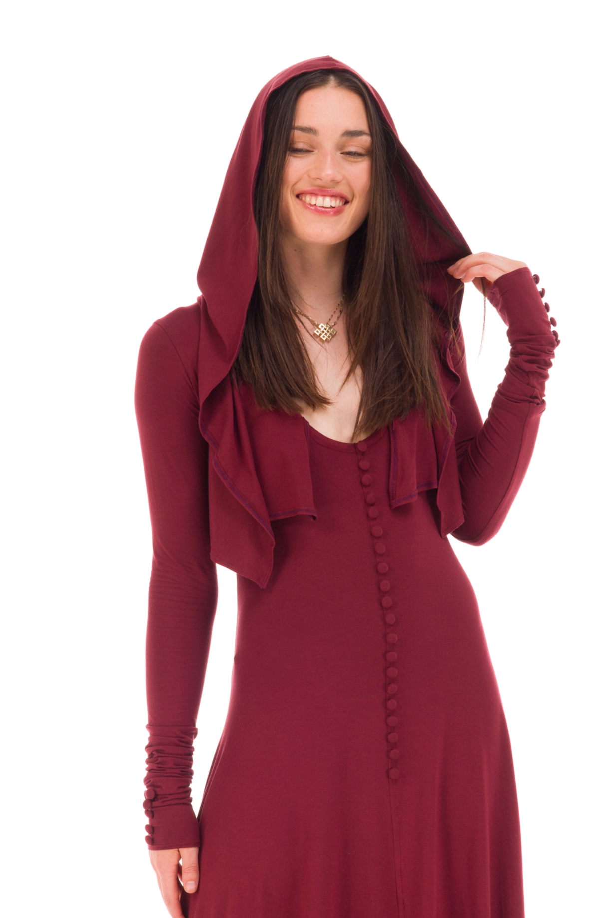The dress is fitted to the hip, intentionally long and has a very flattering well cut hood that looks wonderful worn up or down. A key feature of the dress are the hand crafted cover buttons and the fitted extra long sleeves that look so elegant scrunched up and can be worn like mittens.